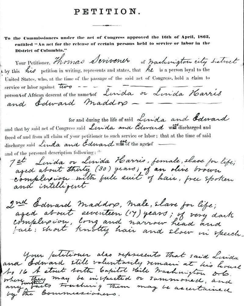 Almost no freed people took up the government on its insulting offer, but DC-area enslavers submitted 966 petitions in the months following the law’s passage. In accordance with eligibility requirements, each filer declared loyalty to the Union and presented itemized descriptions—essentially, invoices—of those they’d enslaved, assigning estimated dollar amounts to each human being. Lincoln empaneled a three-person commission to render a final judgment on the monetary merit of each petition and thus on the black lives described therein.