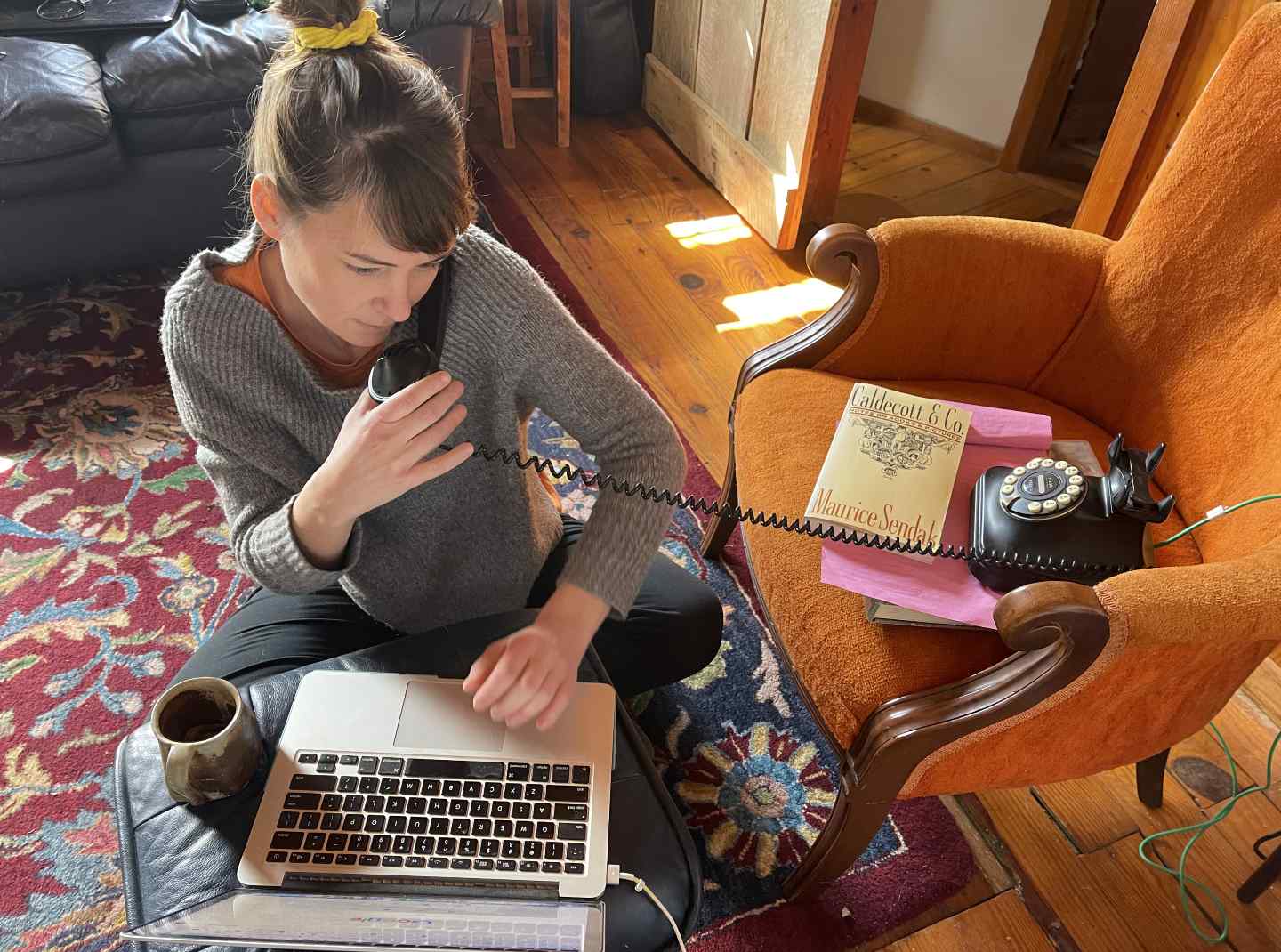 I rented a house down the road from my parents that had been built by my dad’s twin brother. I knew that conducting interviews during Covid would be complicated, and I wanted to ensure that if I became infected, I would not put my parents at risk. There was no cell phone service and poor Internet in the area, so I interviewed meatpacking workers via landline on a black rotary phone, sitting in a chair covered in orange velvet.