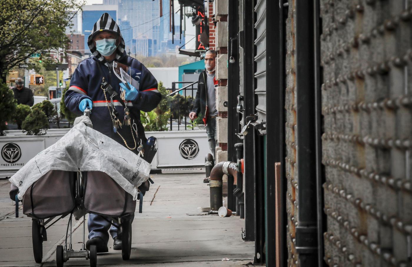 A postal worker wearing a mask and gloves delivers mail in New York City in April.(Bebeto Matthews / AP Photo)