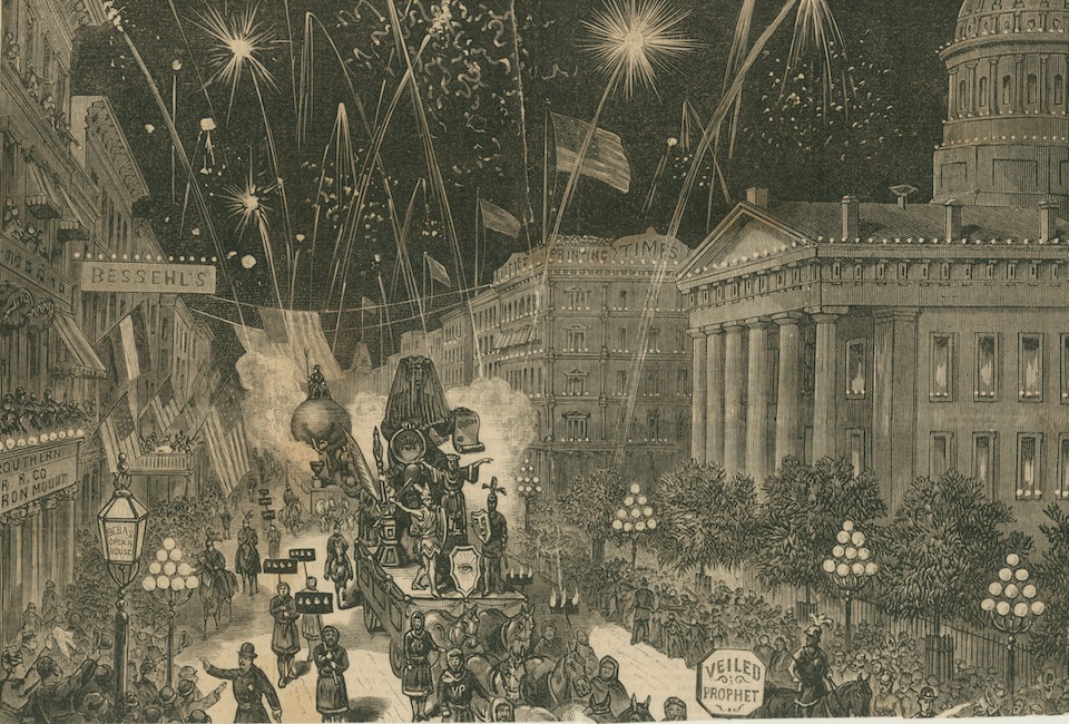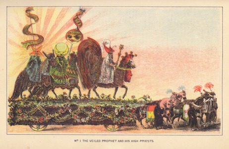 While the Veiled Prophet of Khorassan comes from a character from Thomas Moore’s Lalla Rookh—an evil villain of the Orient (much like Jaffar from Aladdin)—he’s deployed in the context of a decade of heinous Ku Klux Klan violence. Trolley operators, coopers, dock workers, train engineers, and the exploited immigrant classes would have known the Veiled Prophet was a KKK symbol—anti-Black, anti-North, anti-worker.