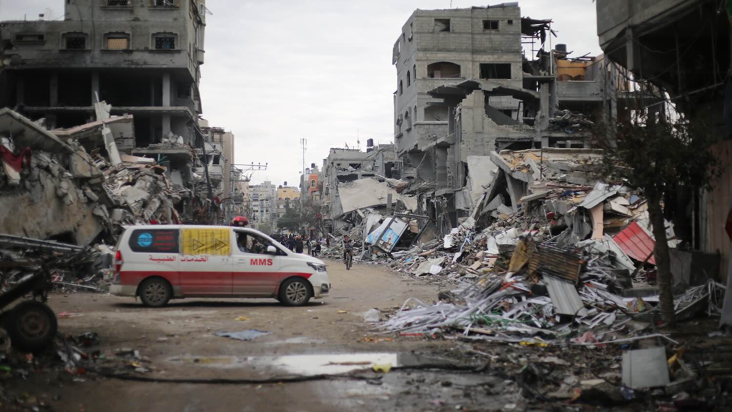 The photo was taken in November 2023 in the Beit Lahia area, moments after a heavy bombardment. It shows an ambulance racing toward Kamal Adwan Hospital in northern Jabalia.