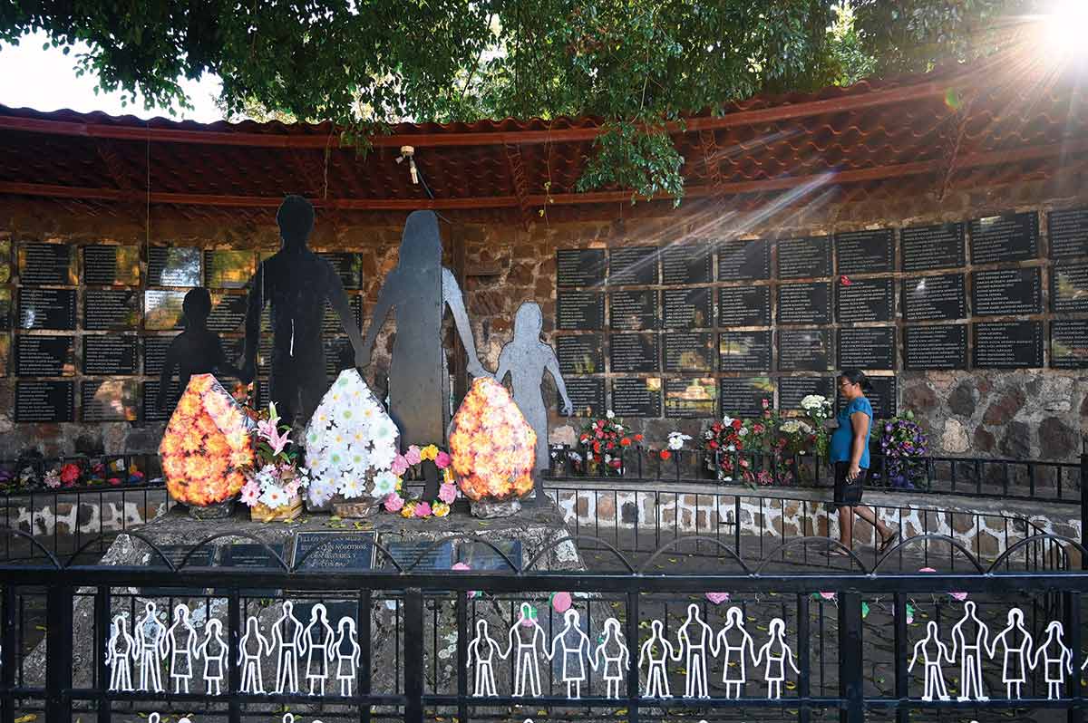Next to the house, behind a chain-link fence, is the memorial that Martinez built under a corrugated tin roof. There is a stone wall, and on it are a crucifix with Jesus Christ draped in a loincloth and 17 black plaques bearing dozens of names of the dead. Martinez tells me of how 24 of his relatives had been killed, pointing to their names. Among them is his mother.