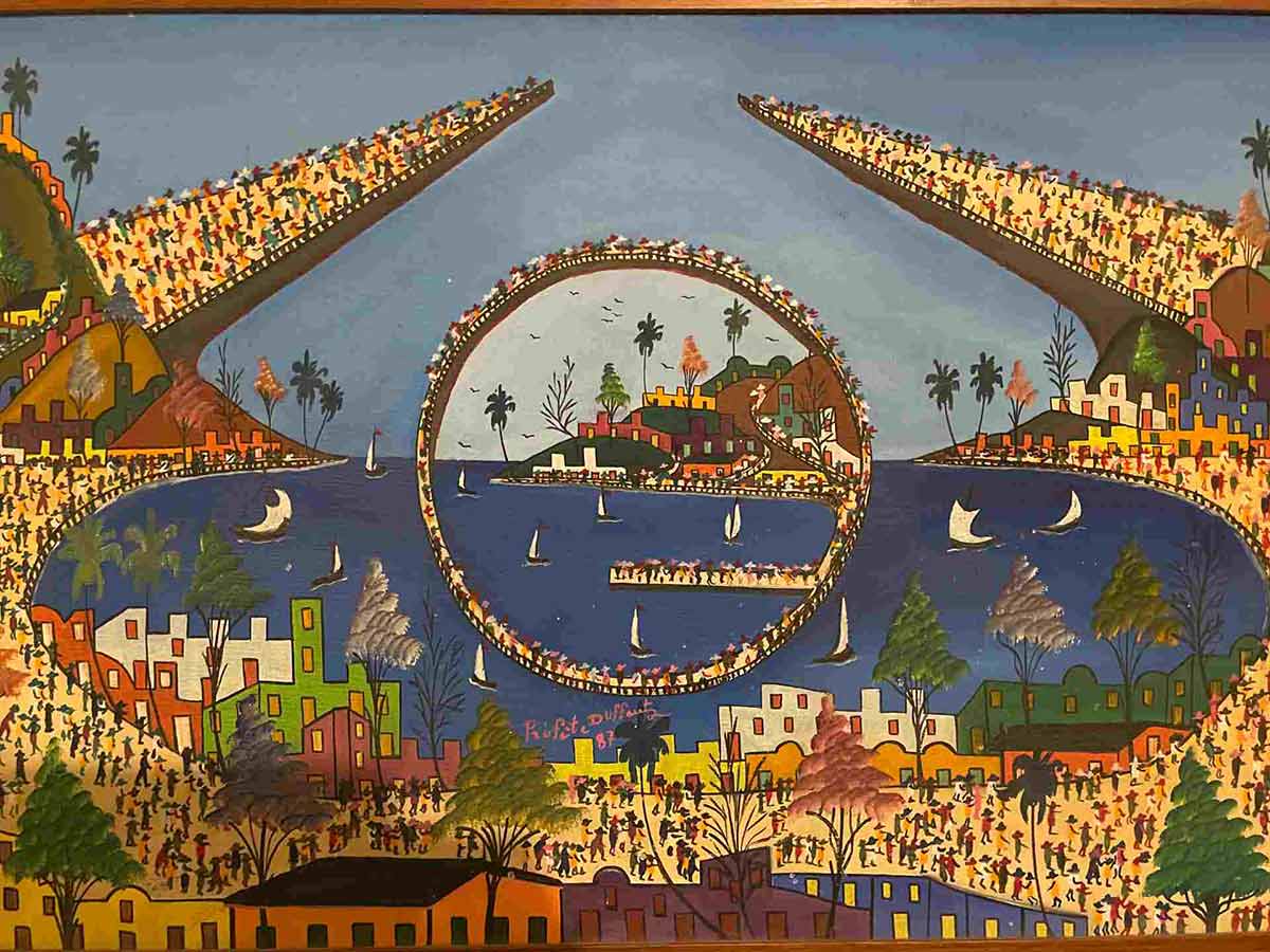 Today, writing this, I went to look at a painting of mine by the great Haitian utopian artist Préfète Duffaut. It was given to me by a friend years ago and was painted in 1987, a year of great promise for Haiti, before the supposed democratic experiment went off the rails, a year after the fall of the dictatorial Duvalier dynasty. It depicts an imaginary coastal city, obviously a Haitian city, that’s based loosely on Duffaut’s hometown, Jacmel, on the southern coast. Most of Duffaut’s paintings depict a similar scene. In the painting, the sparkling city embraces the sparkling sea, and all the residents of the town are out on its broad esplanades, just walking. It could be a holiday. There must be hundreds of tiny Haitians depicted in this painting, all wearing broad hats to protect them from what must be a bright sun, though the sun’s not in the picture. Sailboats are sailing on the sea, and in the middle of the water, which is the middle of the painting, is a great circle like a mirror that reflects back at the viewer (and at the town) the town’s own image, and the frame of the mirror is made up of another crowd of people happily circumambulating in a gravity-defying parade. It’s the way the great visionary painter saw his country: a Haiti pristinely maintained, an island filled with proud Haitians, out in the streets, enjoying their ownership of their land, glad to see themselves in the mirror.