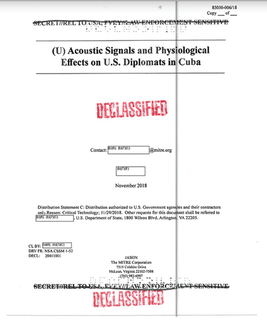 The portion of the document that is readable does not support any such assertions. But 80 percent of the 98-page report, written for the State Department by the elite JASON scientific advisory group, has been redacted on national security grounds—to protect the intelligence operatives present among those in Cuba who experienced what is officially being called an “anomalous health incident.” About half of the approximately 200 cases of AHIs in China, Colombia, Austria, Germany, Australia, India, Vietnam, and other locations have been reported by members of the CIA.