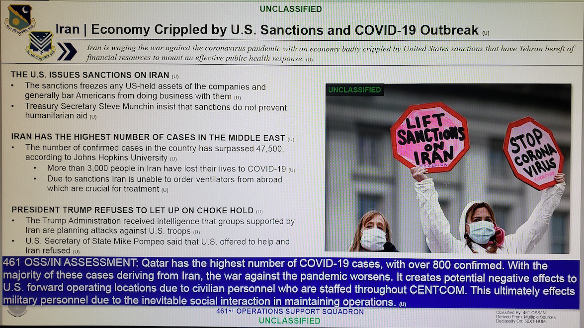 US sanctions on Iran have “badly crippled” its economy as well as its ability to respond to the coronavirus pandemic, which endangers nearby US troops, according to a military intelligence brief obtained by The Nation.