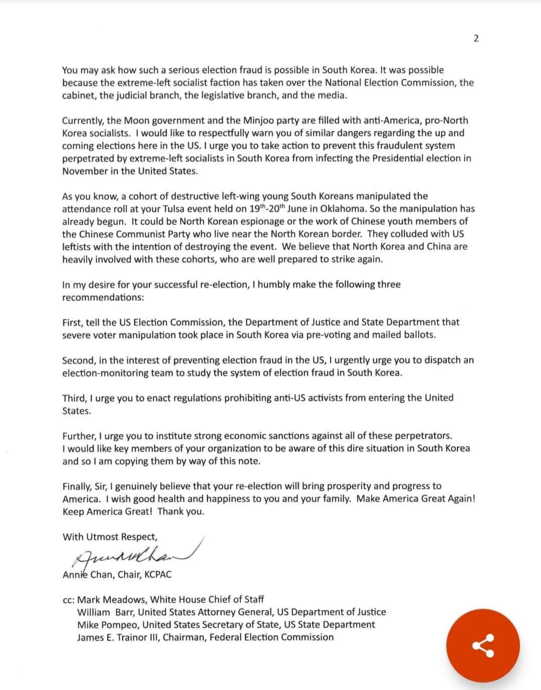 In her letter, Chan compared the US presidential election to the South Korean election in April. “I would like to respectfully warn you,” she wrote, “of similar dangers regarding the up and coming elections here in the US.” The letter was also addressed to White House chief of staff Mark Meadows, Attorney General William Barr, Secretary of State Mike Pompeo, and Federal Election Commission chair James E. Trainor III.