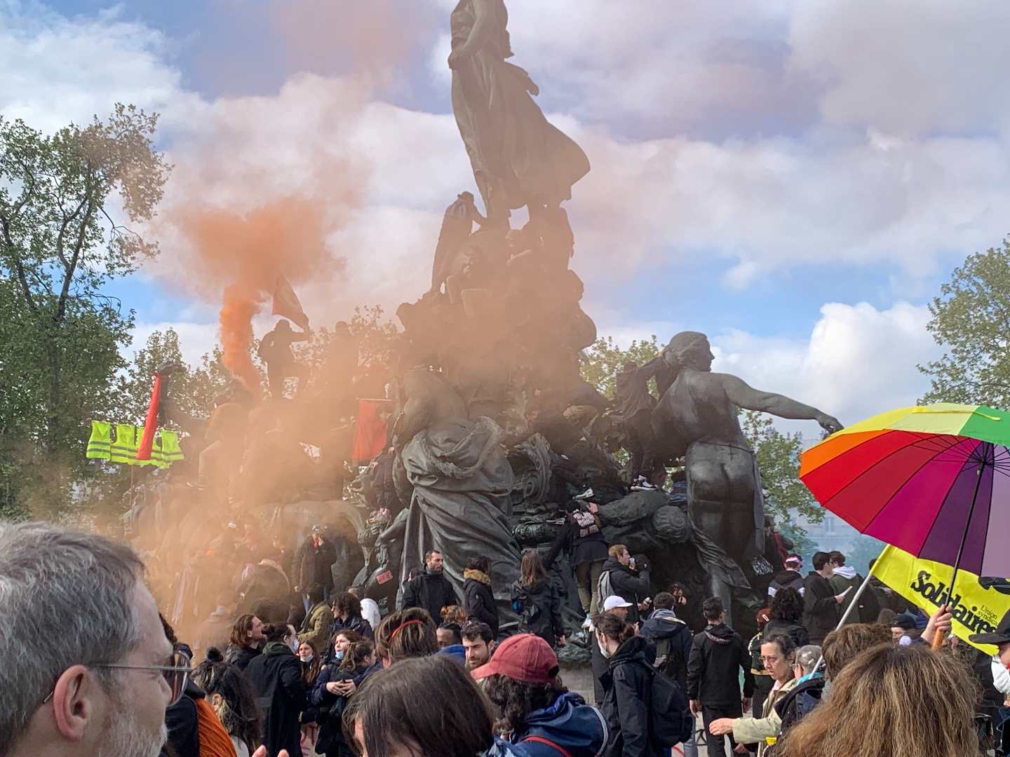 Parisians usually spend May Day awash in celebration, not tear gas. And there was certainly plenty of fun throughout the day, as we marched up Boulevard Voltaire with 112,000 other people singing, chanting, and waving signs representing their unions and their politics. Everyone had showed up: trade unionists in technicolor vests, street artists bearing puppets, rowdy anti-fascists, and revelers of every description, including elders, children, and babes in arms. Politics can be fun if you know how to have a good time, and these people did, from the wildly energetic agricultural union member dancing to disco atop a float with a huge white cow statue to the militant grandmas gleefully chanting along to the bloodthirsty slogans and the queer Marxist bloc with their hot pink flares. Even a burst of rain couldn’t dampen their spirits (though the resultant mud did smudge more than a few hemlines).