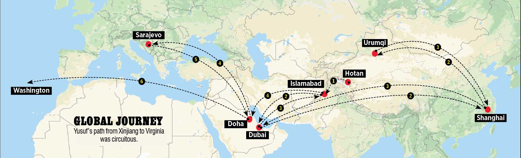 But Yusuf never made it past Bosnian border control: Officials declined to recognize his travel document. He was sent back to Doha and booked on a Qatar Airways flight to Beijing.