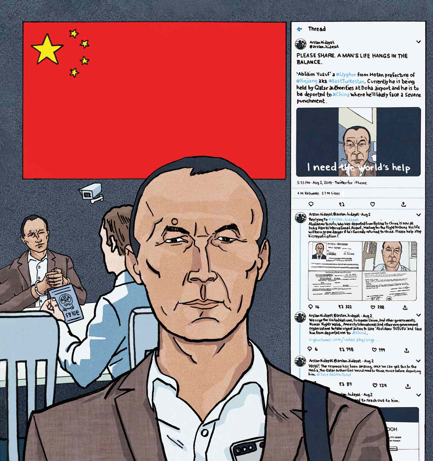 With nothing to lose, he recorded a video on his phone to share on Facebook. “My name is Ablikim,” he started, with the airport’s glowing shops and bustling passengers filling the frame behind him. “I am currently being held at Doha airport, about to be deported to Beijing, China…. I need the world’s help.”