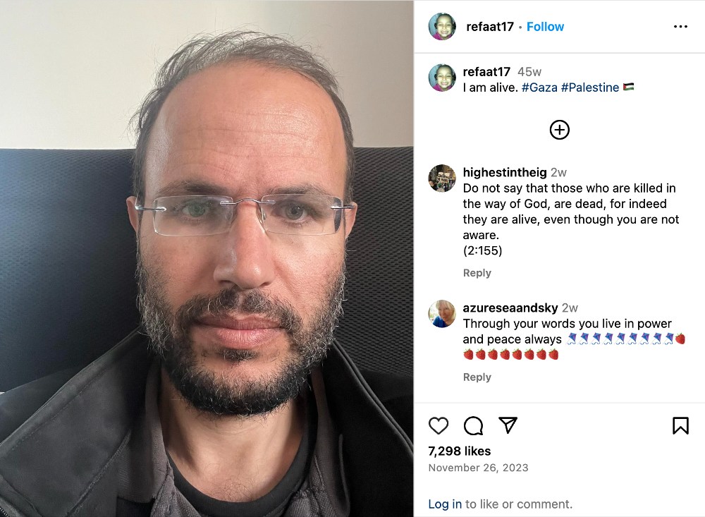 Since the start of the ongoing war, Refaat turned to social media and his writing to document the daily struggles for survival that he and his family faced, as Israel deprived the enclave of basic necessities—water, electricity, food. He chronicled the brutality his people endured with unwavering bravery and eloquence. His words captured global attention, drawing digital support and solidarity from around the world.