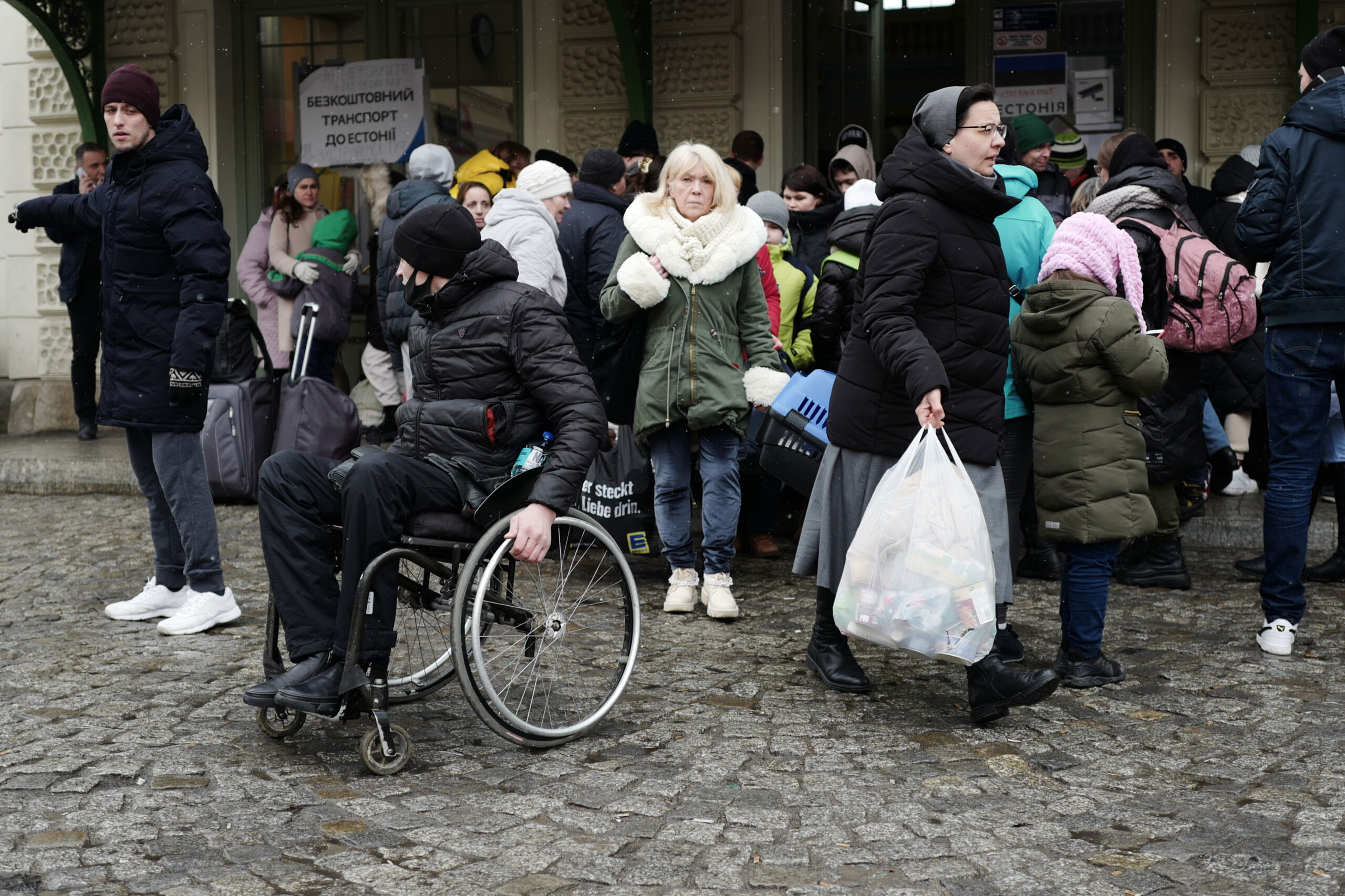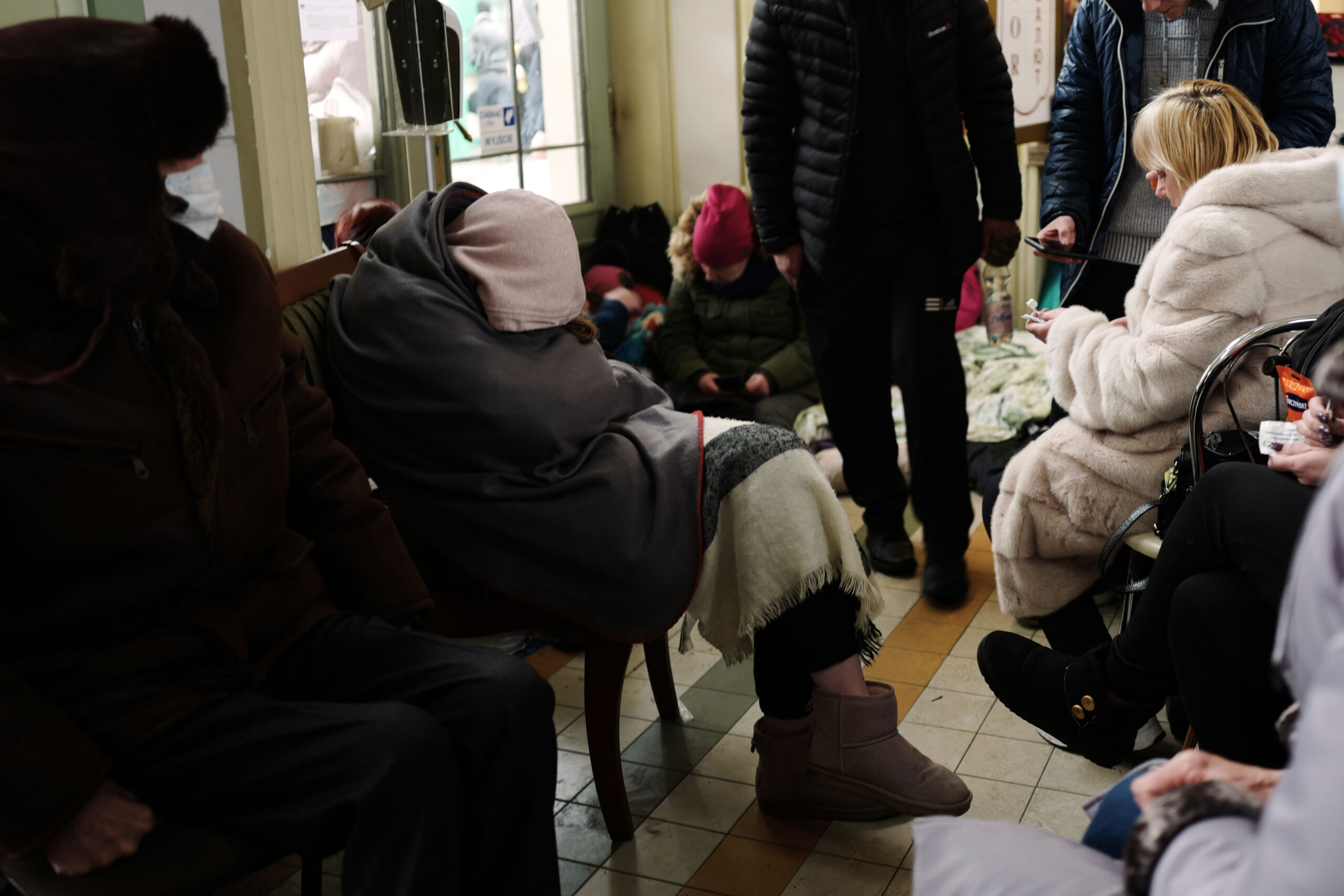 But still the refugees keep coming, the scene at the station more reminiscent of the era in which the station was built, with shivering women in patterned headscarves sitting on the floor, warming themselves over mugs of coffee, and bustling nuns trying to guide children to safety. Many of the refugees are women and children, because men between 18 and 60 must stay to be conscripted in Ukraine.