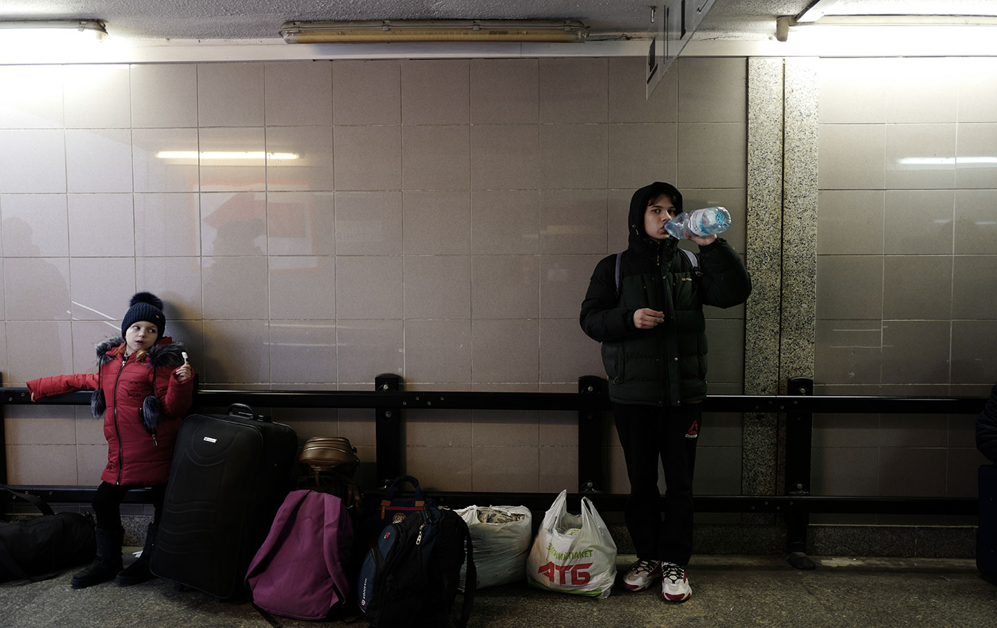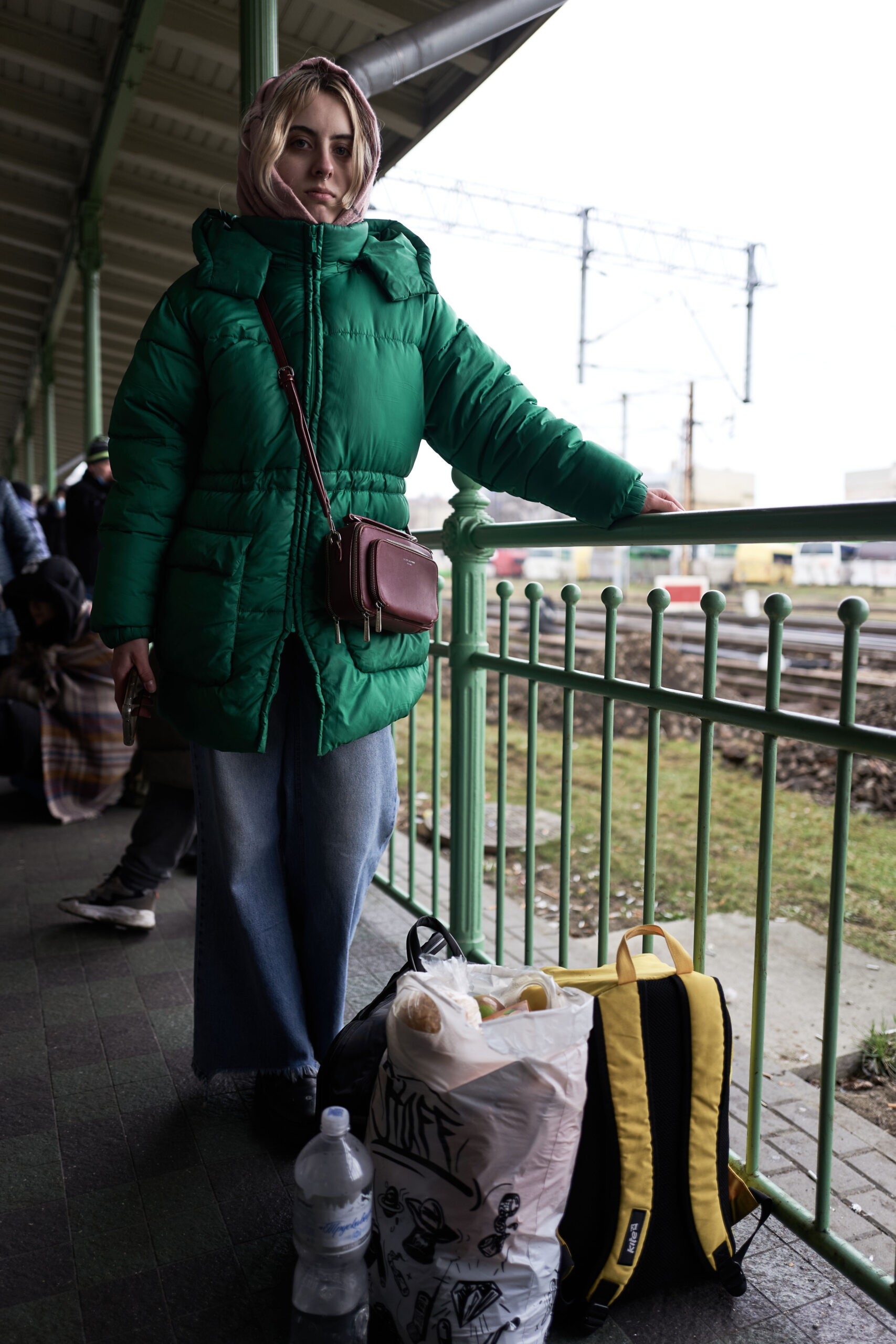Nearby, overlooking the platform, Iryna Mirovshnychenko, 21, wearing a nose ring and a vibrant green puffer jacket, also leaned against a railing, smoking. She had been studying Dutch language and literature in Kyiv until Russian troops invaded the country. “I was scared because of the war, and I live in a dormitory,” she told me. “Some of the windows were shattered by bombs.”