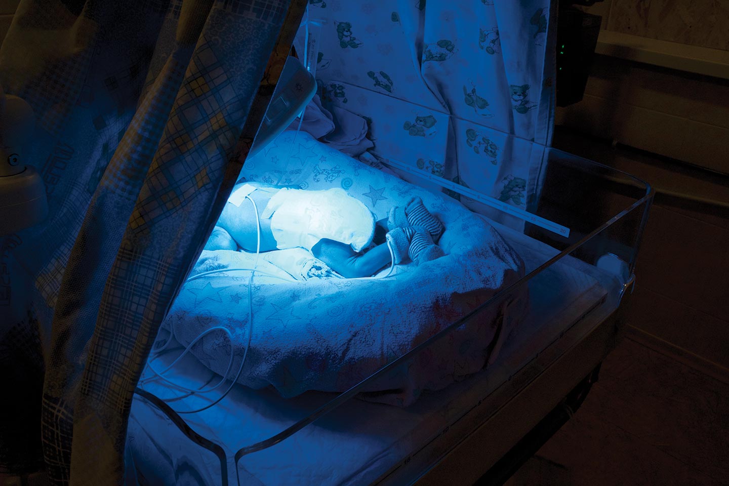 Born at 33 weeks’ gestation, Solomiia weighed a mere three pounds, eight ounces, at birth and required treatment for pneumonia and jaundice. Although she’s the only newborn in the ward lying under a blue light, to help clear the jaundice-causing bilirubin from her system, Solomiia is not the only baby fighting off pneumonia and struggling to gain weight. The oldest child in the ward—in this case referring to gestation rather than date of birth—was delivered at 35 weeks of pregnancy. All of the four babies in the six-bed unit had underdeveloped lungs at birth or are clearing a case of pneumonia.