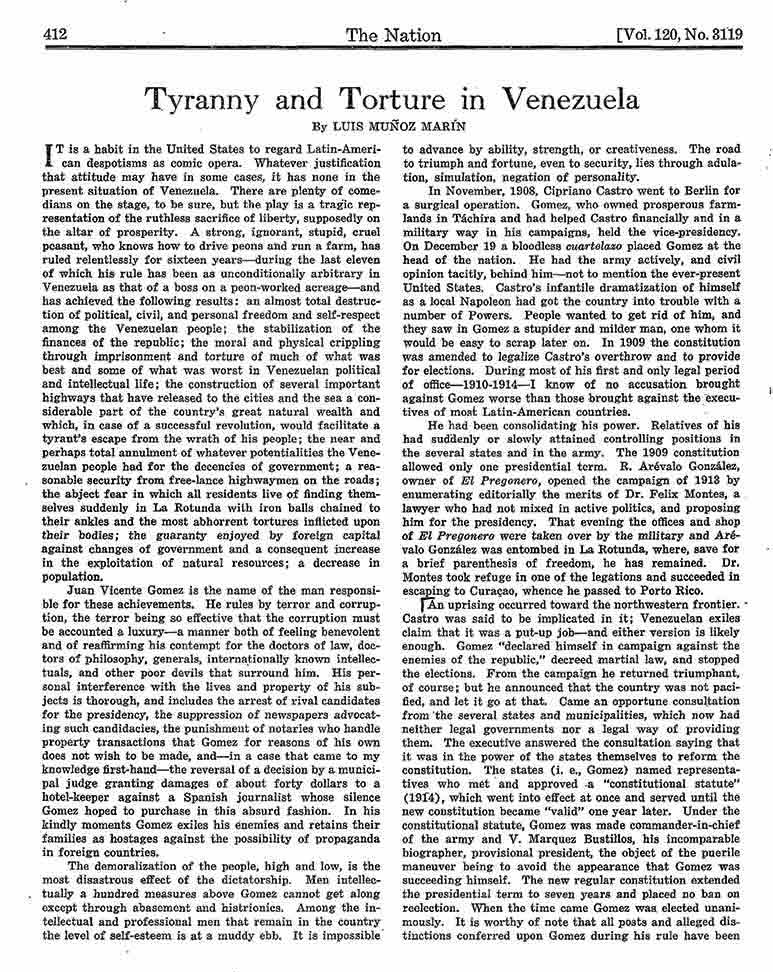 Regrettably, that is just what the US government did, repeatedly meddling in Latin America to prop up rulers who preyed on their own people and served corporate interests. From 1908 to 1935, Venezuela was ruled by Juan Vicente Gómez, a dictator who governed “by terror and corruption,” as the great Puerto Rican journalist and politician Luis Muñoz Marín wrote in these pages in 1925. Gómez invoked martial law, replaced the constitution, and tortured and imprisoned his critics. “The picture is lurid and grotesque,” Muñoz Marín concluded.