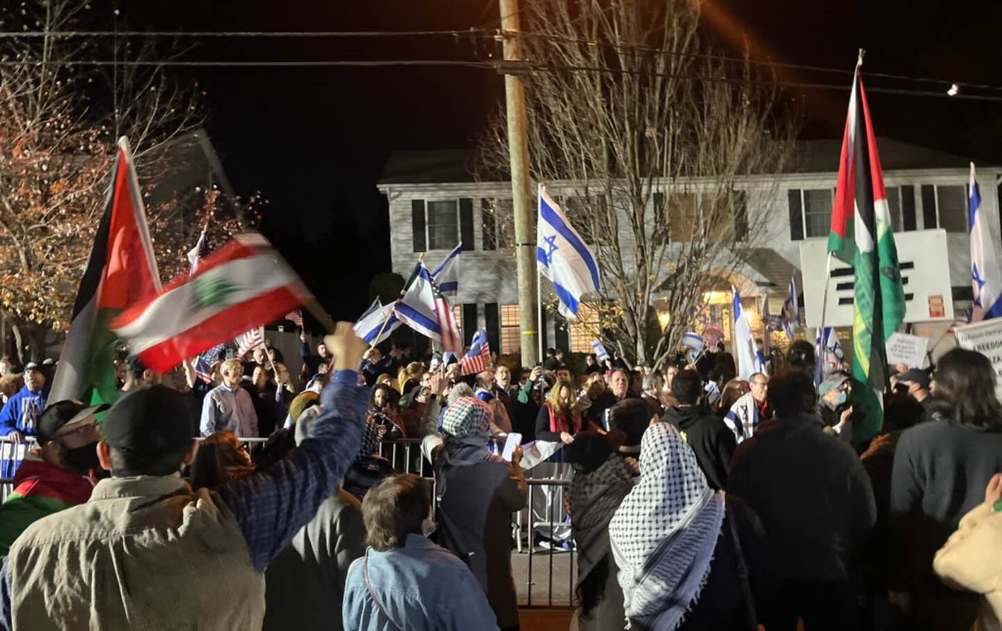Still, I wanted to see these events for myself. So on the evening of November 7, I drove to Bergenfield, New Jersey, where I had heard of a planned protest at one of Borvick’s events. Outside the venue—a suburban villa in a line of neat row homes on a residential street—pro-Palestine activists faced off against a pro-Israel crowd, separated by metal barricades monitored by New Jersey police. Many of the street’s homes sported “Trump 2024” signs on their lawns and banners blending the Israeli and American flags. Among the pro-Palestine crowd were Jewish anti-Zionist groups holding signs reading “True Jews can’t buy stolen bloody earth.”
