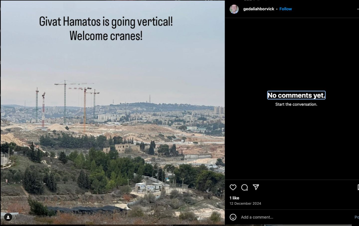 On December 12, 2024, Borvick posted an Instagram photo of a lush, green landscape interspersed with old abandoned buildings. In the background, an arid, rocky terrain with an ongoing construction site was visible. “Givat Hamatos is going vertical! Welcome cranes!” Borvick wrote. Givat Hamatos, a new settlement, is just over three miles away from Abu Diab in Al Bustan, built on roughly 70 acres of confiscated Palestinian land.