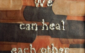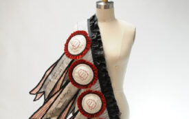 Embroidery reads: “Speaking up again and again and again,” “Fighting harder for what you have earned,” “Resilience, perseverance, and exhaustion,” etc