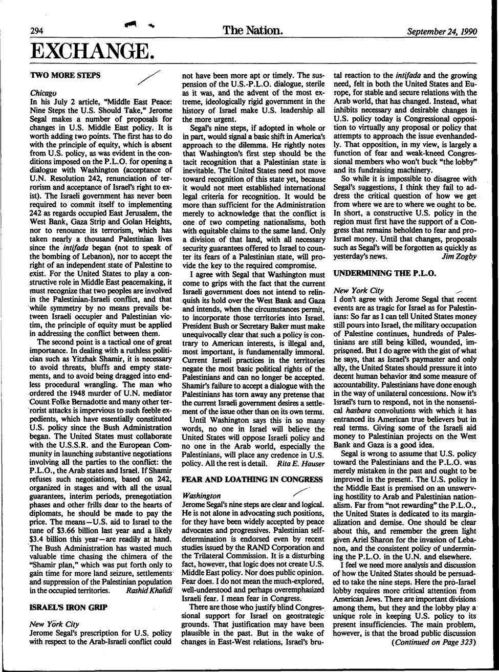 In the article, "Middle East Peace: Nine Steps the U.S. Should Take," published in the July 2, 1990 issue of this periodical, Jerome Segal makes a number of proposals for changes in U.S. Middle East policy. It is worth adding two points. The first has to do with the principle of equity, which is absent from U.S. policy, as was evident in the conditions imposed on the Palestine Liberation Organization for opening a dialogue with Washington. For the U.S. to play a constructive role in Middle East peacemaking, it must recognize that two people are involved in the Palestinian-Israeli conflict, and that while symmetry by no means prevails between Israeli occupier and Palestinian victim, the principle of equity must be applied in addressing the conflict between them.